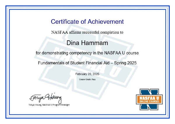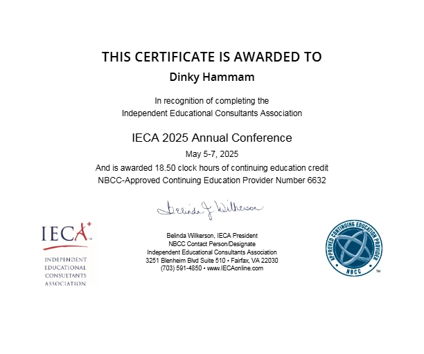 A member of NACAC and IECA, I maintain important connections, stay abreast of the collegiate landscape and complete trainings that are essential to promote effective results. Currently, I am focused on financial aid training and essay writing workshops.